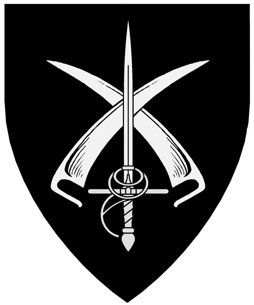 Sable, two scythe blades in saltire surmounted by a rapier argent.